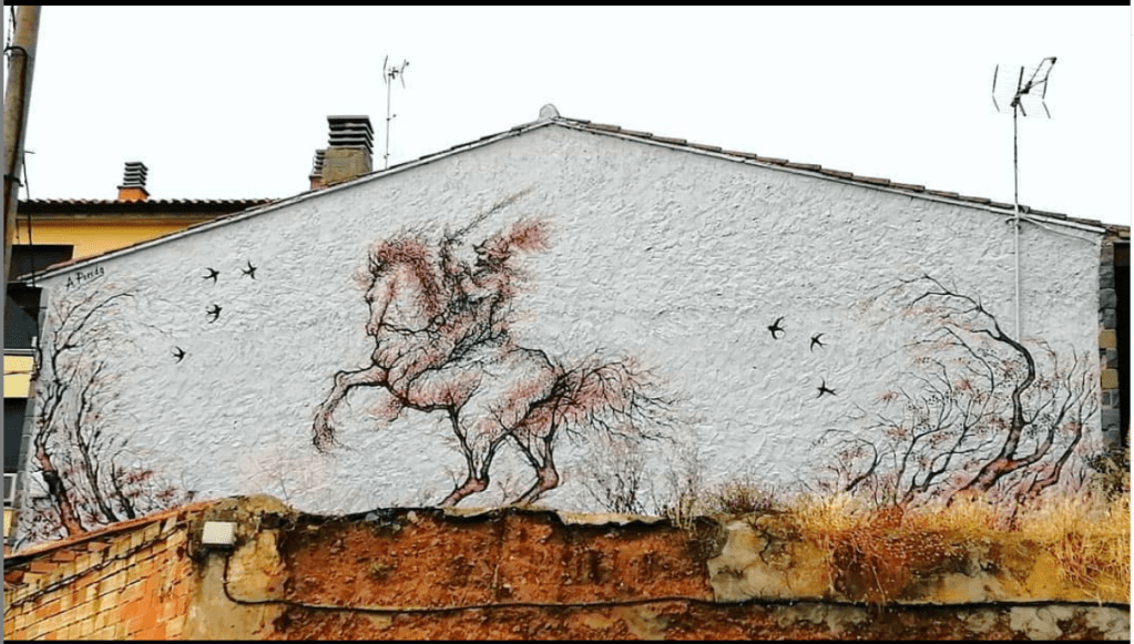 Pero vamos a ponernos en situación… El 20 de julio de 2019 con motivo del Día de la comarca el Ayto de Trasmoz encargo un mural conmemorativo de Bécquer y, he aquí, donde entra en escena Adrián, siendo el encargado de su realización. Posteriormente, en Febrero del 2020, durante las fiestas de invierno en Honor a San Roque, estuvo realizando uno más pequeñito con el nombre del Salón Polivalente y hace unos días, lo podías ver subido a las alturas haciendo el mural de un caballero a lomos de un caballo.